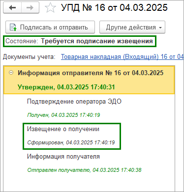 Загрузив информацию получателя, отправитель документа формирует соответствующее извещение о получении и отправляет его контрагенту.