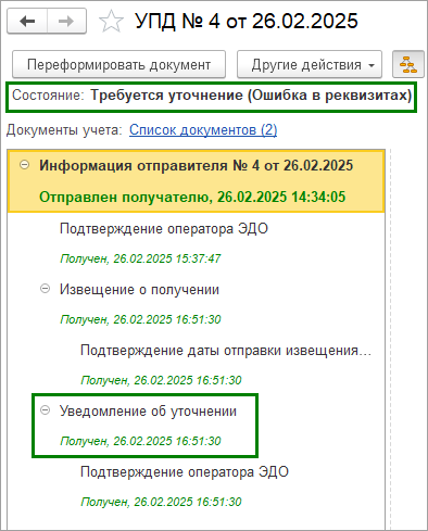 Требуется уточнение — данное состояние означает, что контрагент отклонил документ. В ответ отправителю отсылается «Уведомление об уточнении», в котором указана причина отказа.
