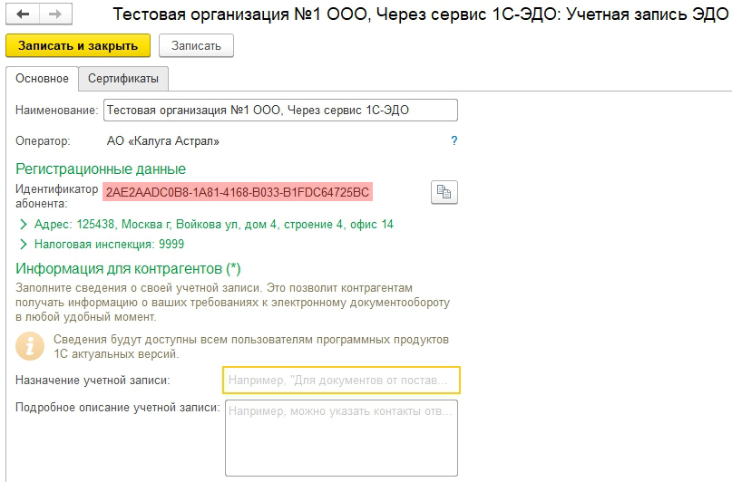 Следует заполнить назначение и описание учётной записи. Данные сведения будут видеть все пользователи 1С при настройке связи по ЭДО с Вашей организацией.