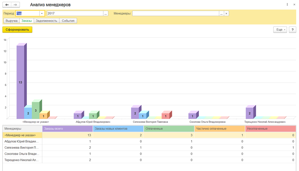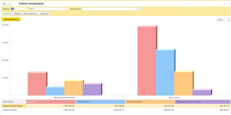 - Анализ работы менеджеров по количеству лидов, клиентов, выручке, валовой прибыли, общей и просроченной задолженности, а также другим критериям.