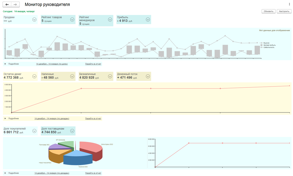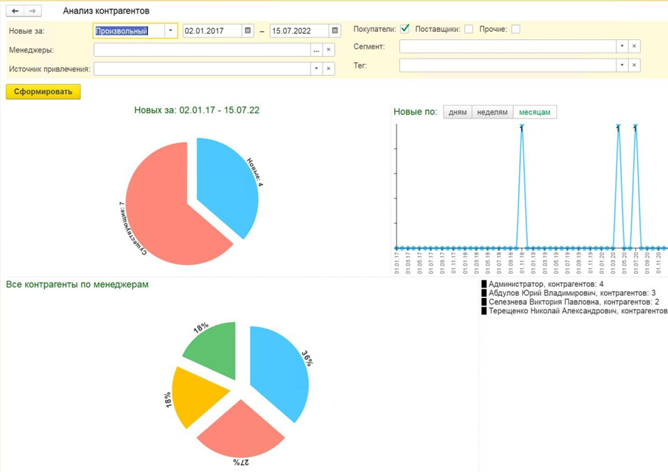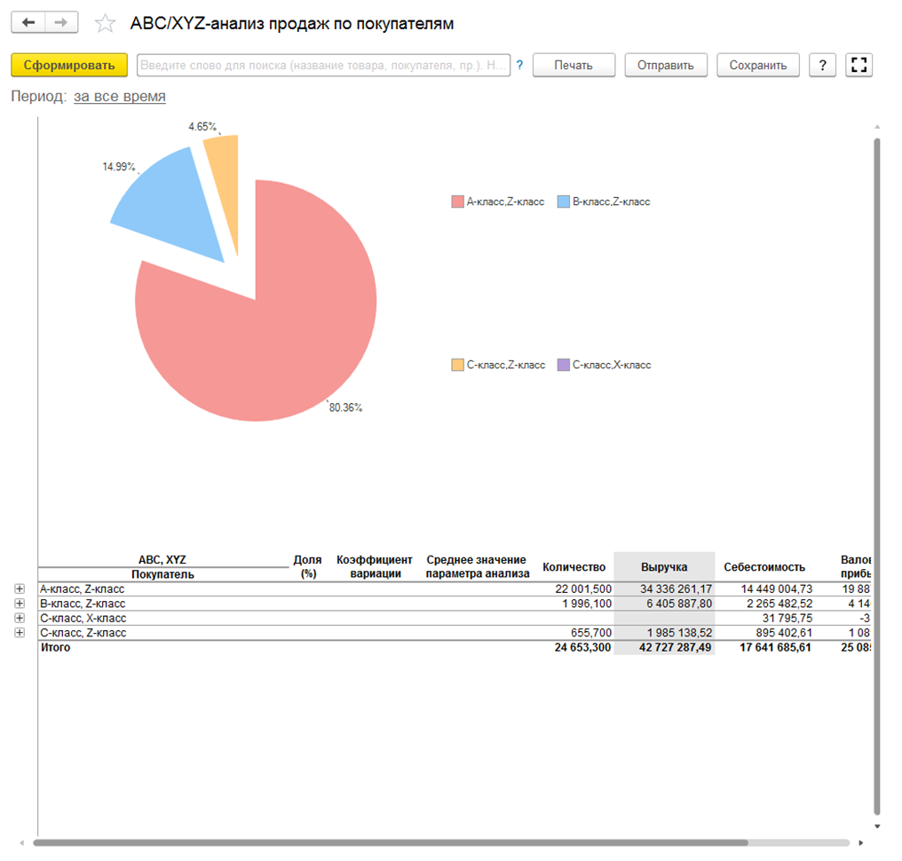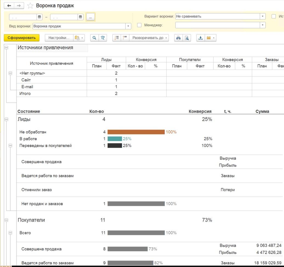 - Создает различные отчеты для анализа и динамики продаж, собирает воронки продаж, проводит abc/xyz-анализ клиентов и позволяет контролировать взаиморасчеты и задолженности.