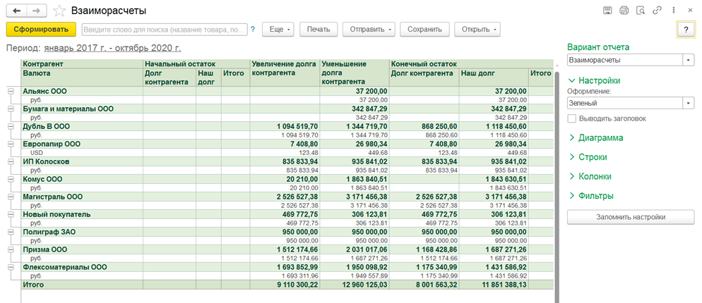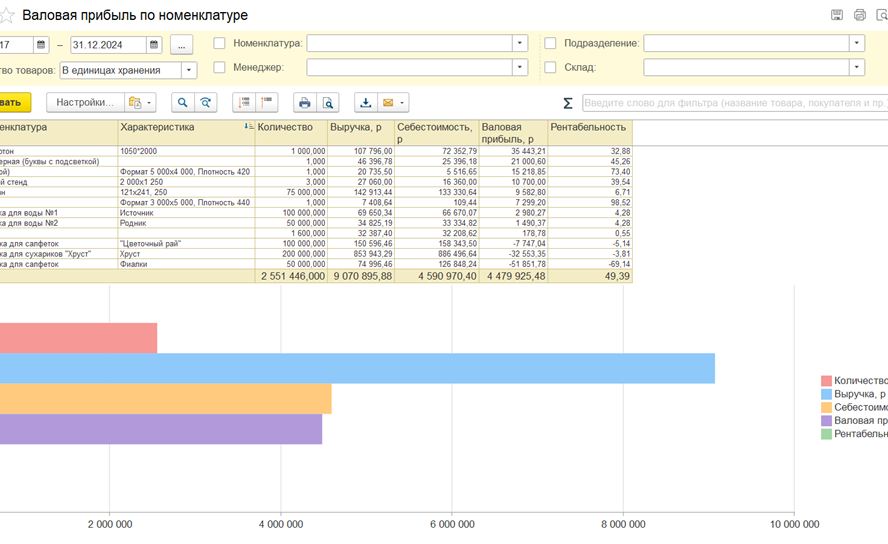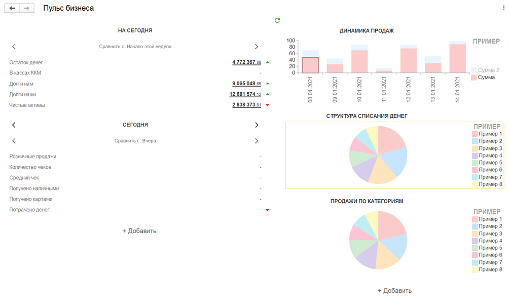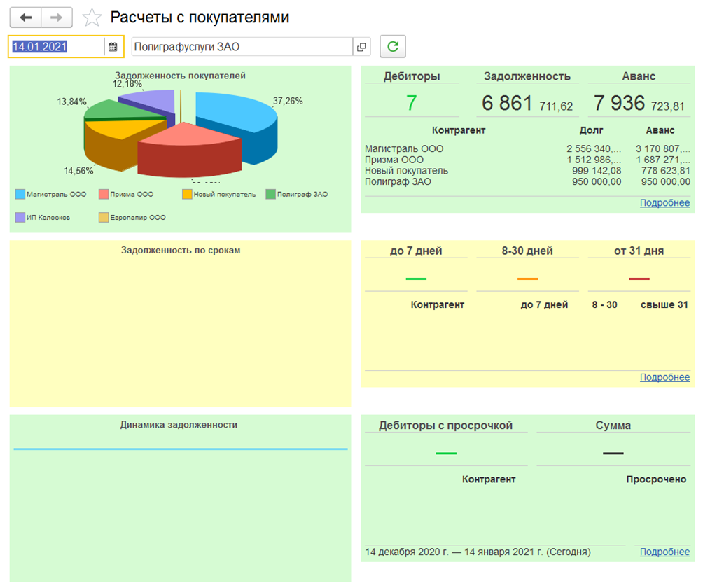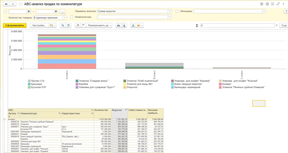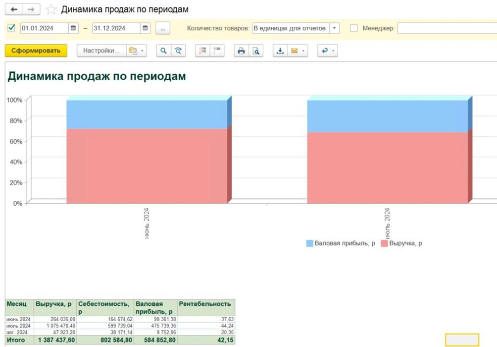 - Создает различные отчеты для анализа и динамики продаж, собирает воронки продаж, проводит abc/xyz-анализ клиентов и позволяет контролировать взаиморасчеты и задолженности.