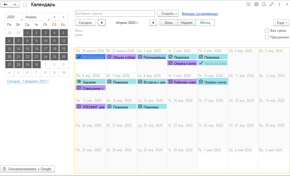 - Присутствует функционал календаря. Это единое рабочее место, где можно работать с событиями, заданиями на работу и произвольными записями календаря. Для каждого сотрудника автоматически ведется персональный календарь.
