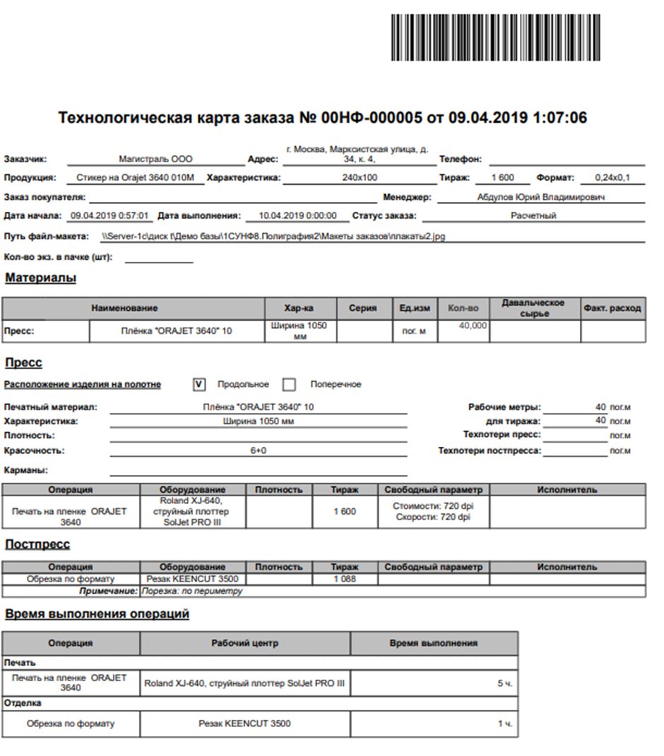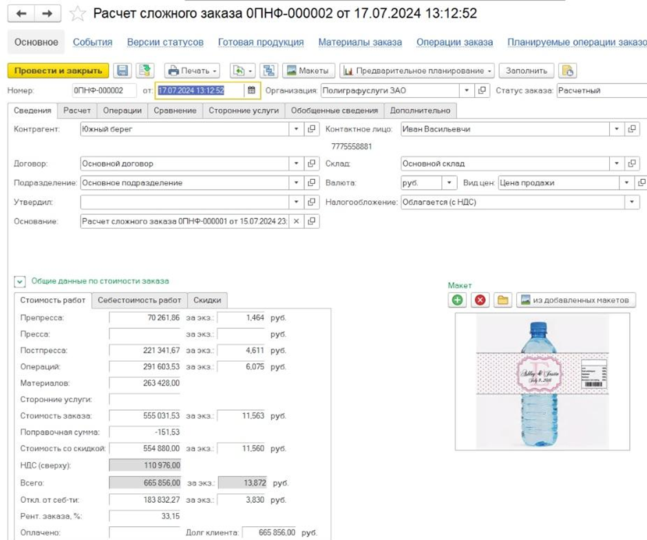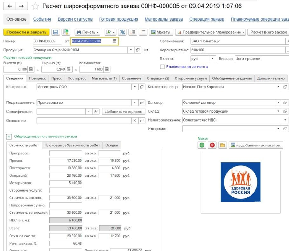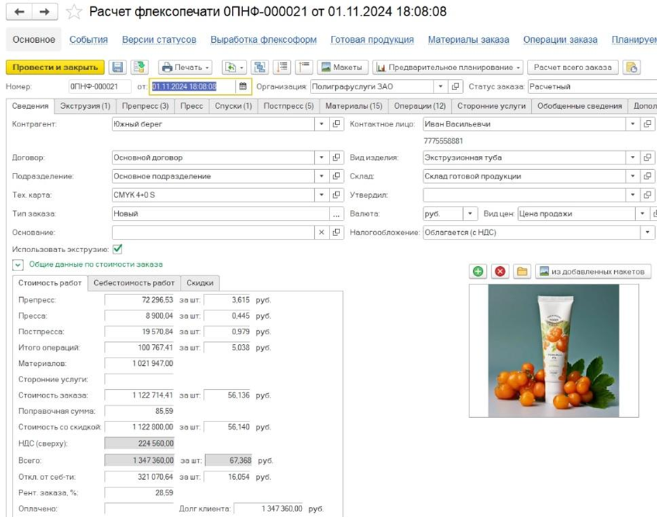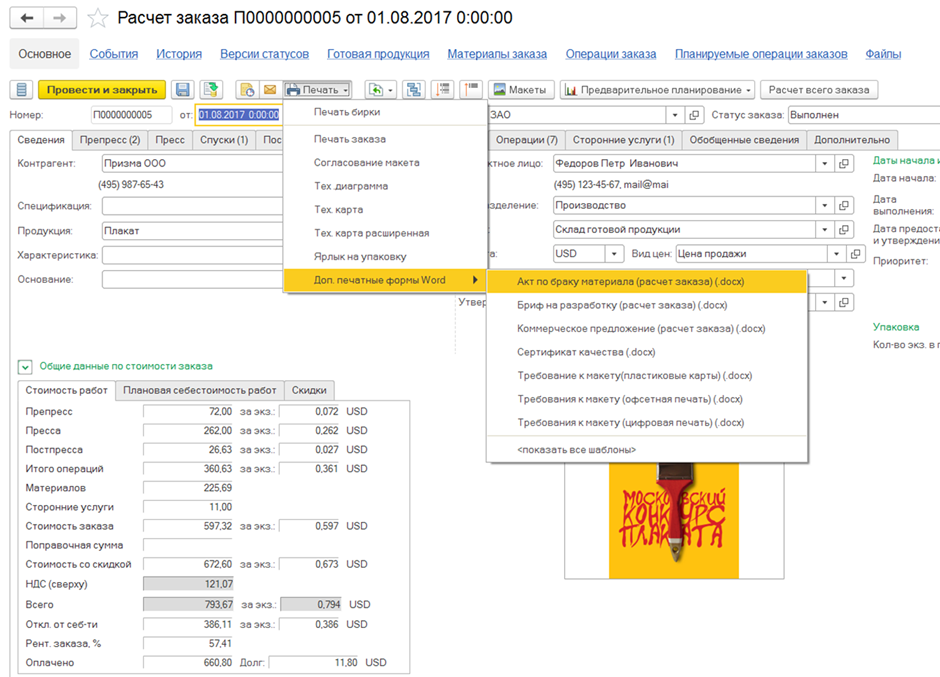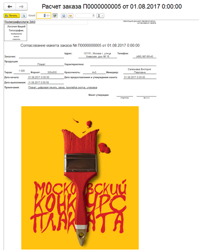 - Формирует формы заказа, техкарты, осуществляет согласование макетов и любых пользовательских форм с автоматическим заполнением реквизитов.