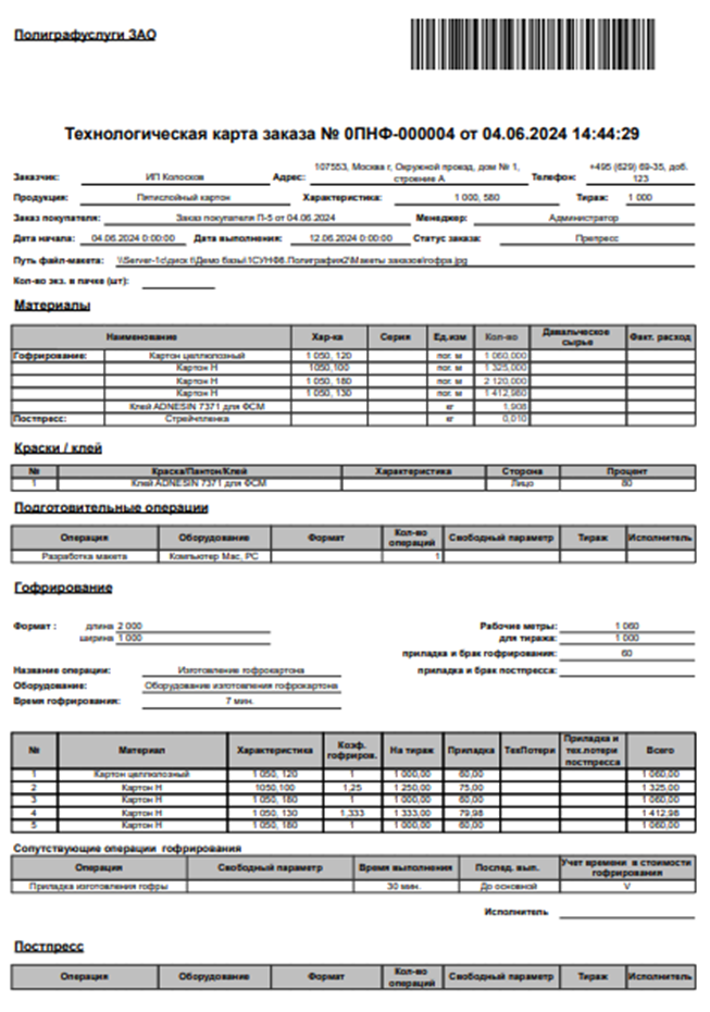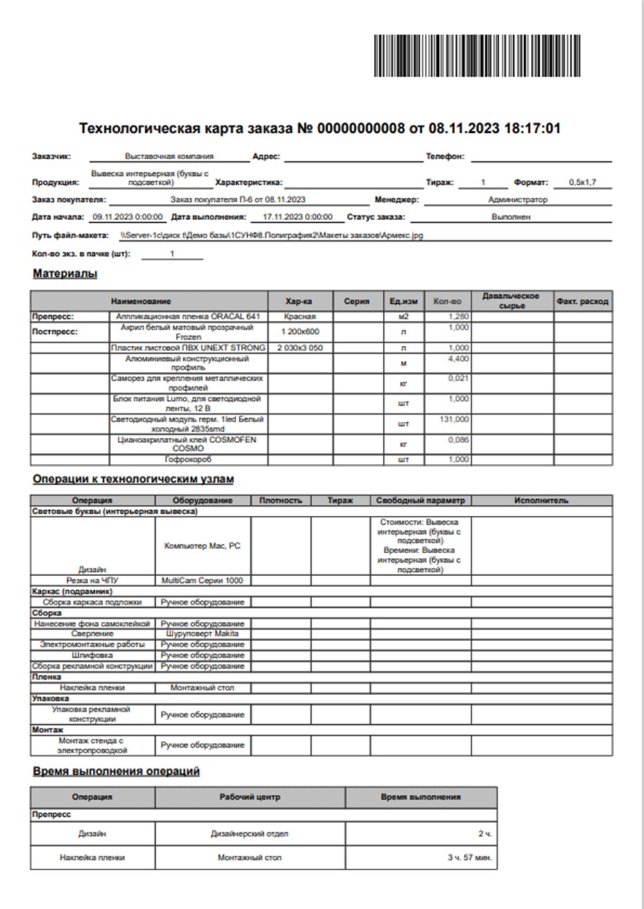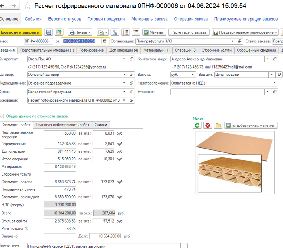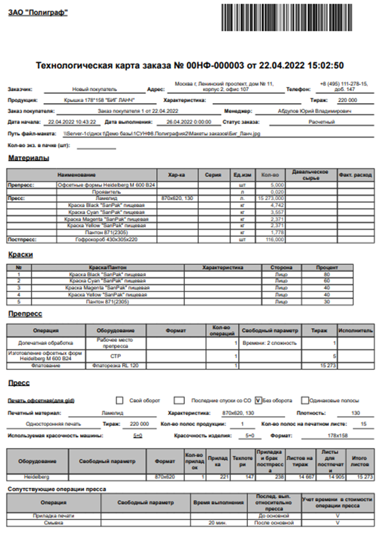 - Формирует формы заказа, техкарты, осуществляет согласование макетов и любых пользовательских форм с автоматическим заполнением реквизитов.
