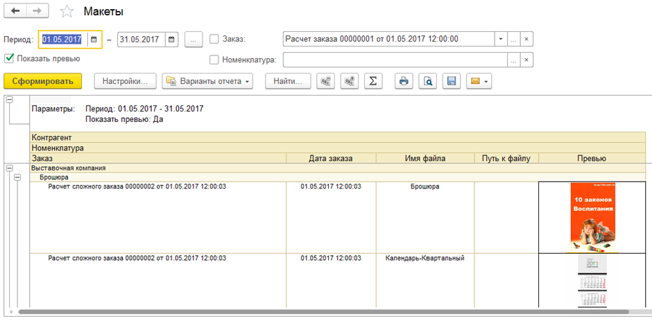 - Отчет «Макеты» — формирует сводную информацию о клиенте, его заказах, дате заказа, полном имени (пути) файла «превью» («preview») и самого файла макета за интервал дат. Стандартные настройки отчета позволяют отбирать данные по заказу и/или номенклатуре. И отображать/не отображать «превью» («preview»).