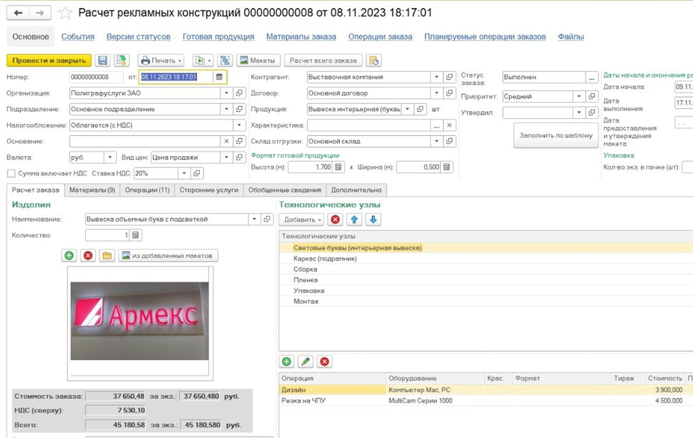 - Программа позволяет автоматически рассчитывать время выполнения и предварительное планирование заказа, расчет материала.