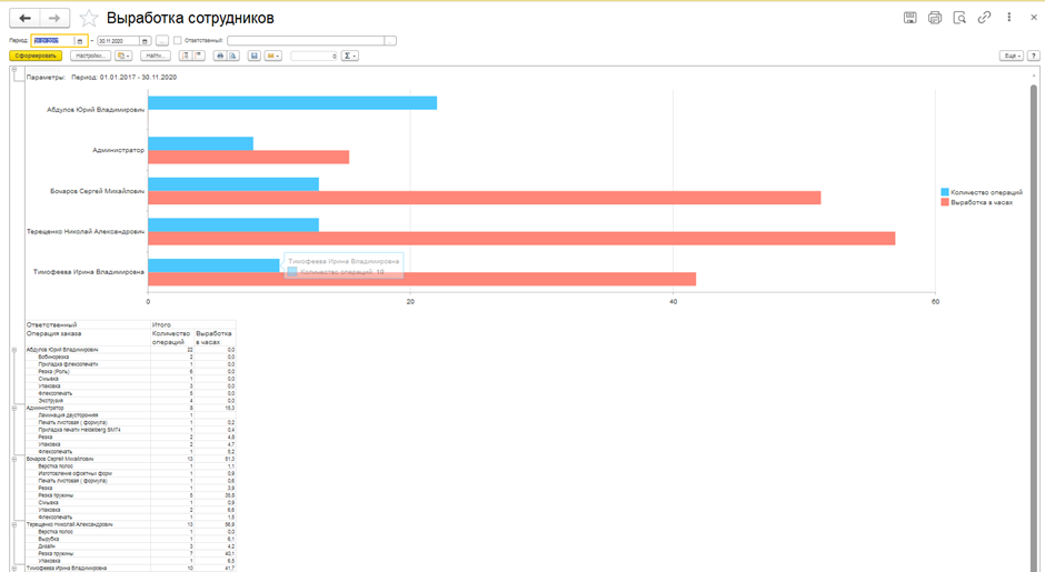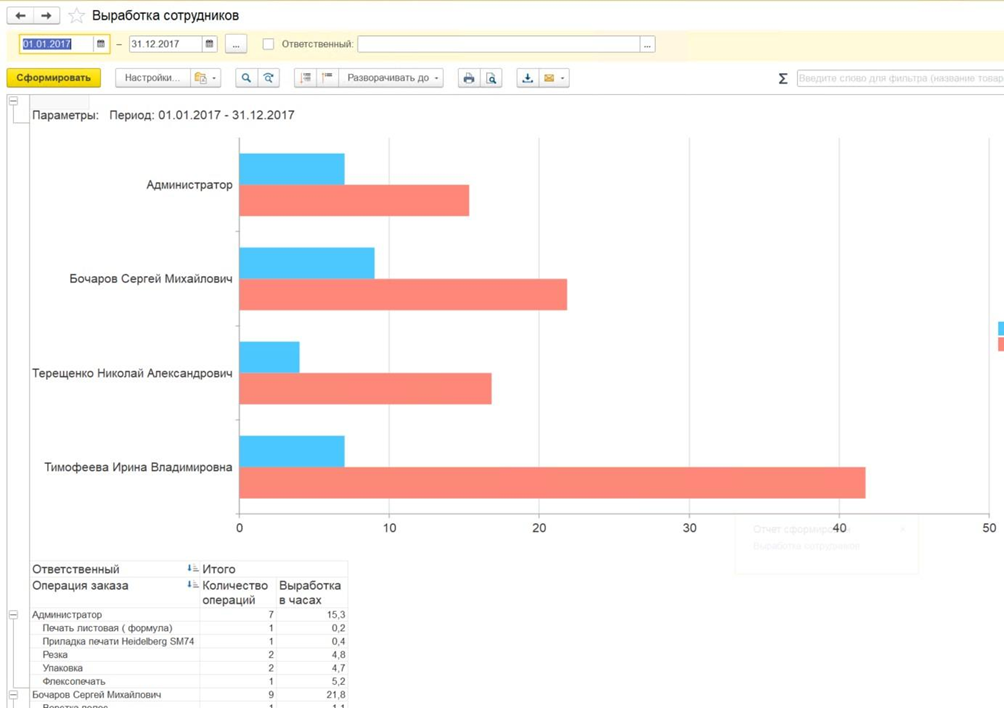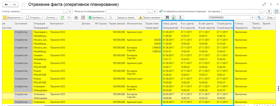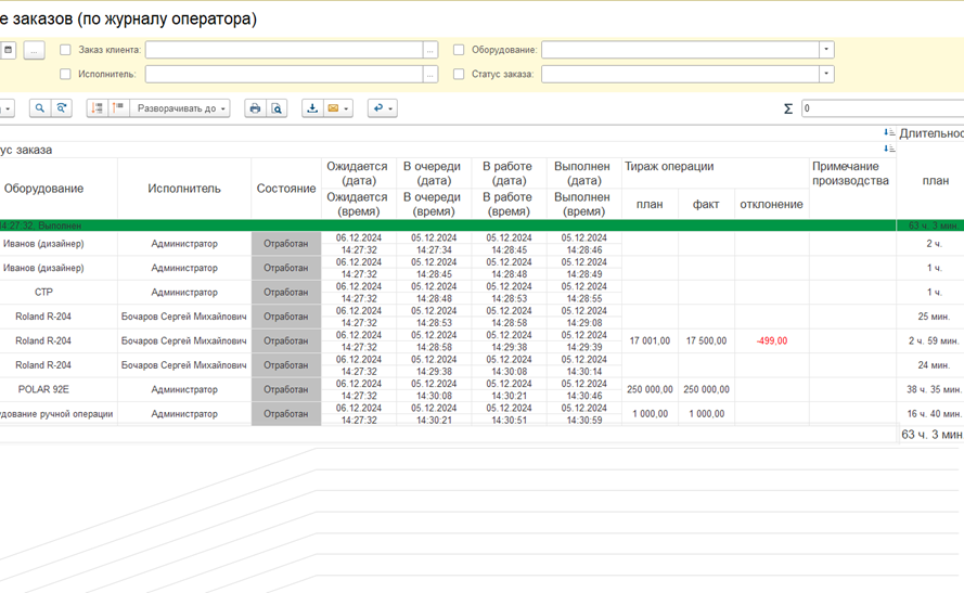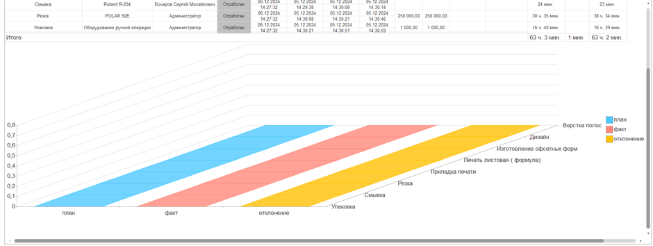 - Система собирает большое количество данных для проведения план-фактного анализа производства: выработку сотрудников, показатели выполнения заказов, брак материала, приостановки заказов.