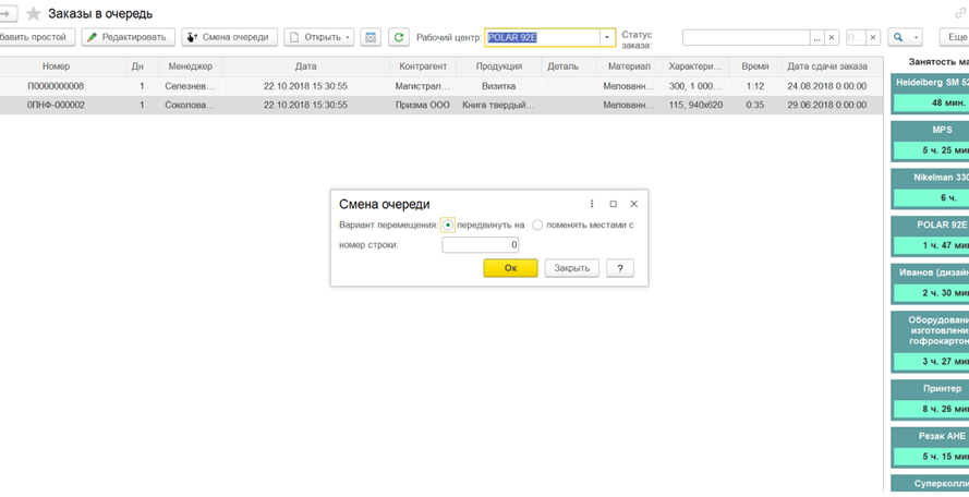 - Возможно изменение очередности заказов, разделение заказа по сменам, смена исполнителей, работа бригадой.