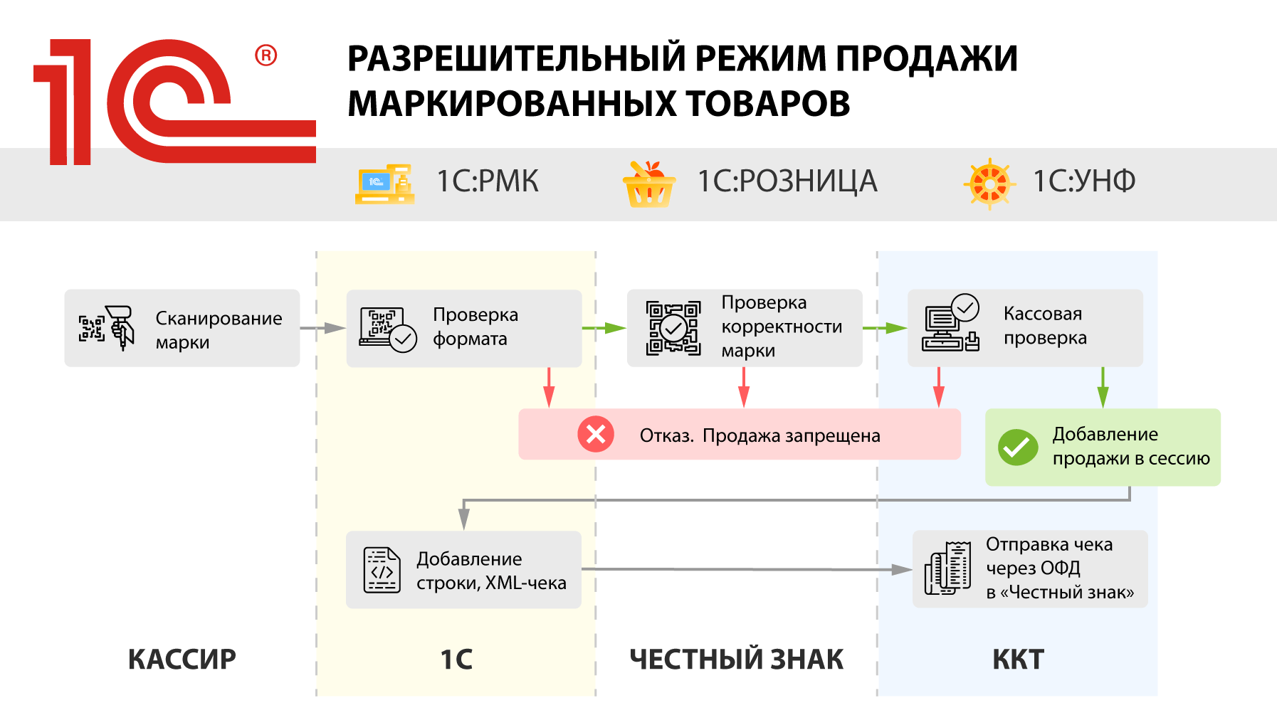 Разрешительный режим работает на кассе при продаже маркированного товара. Кассир считывает код маркировки и он проверяется в системе «Честный знак». Если код прошел проверку — продажа разрешена, если нет — запрещена и на кассе появится уведомление.