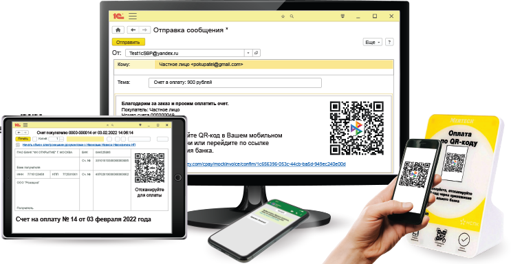 - Продавец может вывести функциональную ссылку в виде QR-кода на экран своего компьютера, дисплей покупателя, распечатать на счете или отправить по электронной почте или sms.