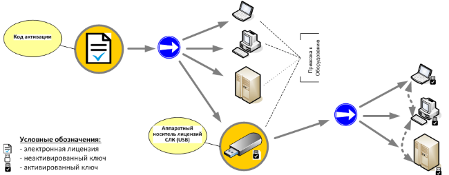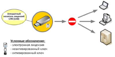 Каждый ключ содержит заданное количество лицензий, которое определяет максимально возможное число одновременно занимаемых лицензий. Кроме того, ключ защиты может быть аппаратным или программным. Аппаратный ключ защиты представляет собой ключ, подключаемый в USB разъем компьютера. В качестве программного ключа используется код активации, представляющий из себя число-буквенный код, предназначенный для получения программной лицензии. Программная лицензия хранится на жестком диске компьютера. Также предлагается к использованию объединенный вариант аппаратно-программного ключа защиты. Смысл объединенного варианта заключается в том, что пользователь может на месте выбрать требуемый вид ключа защиты в зависимости от потребностей: будь то необходимость периодического переноса рабочего места (предпочтителен аппаратный ключ), будь то «облачное» расположение рабочей базы (необходим программный ключ). |
