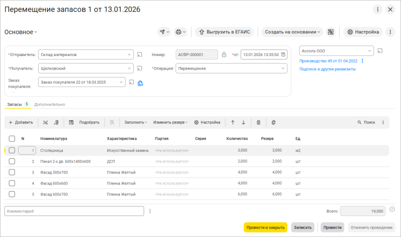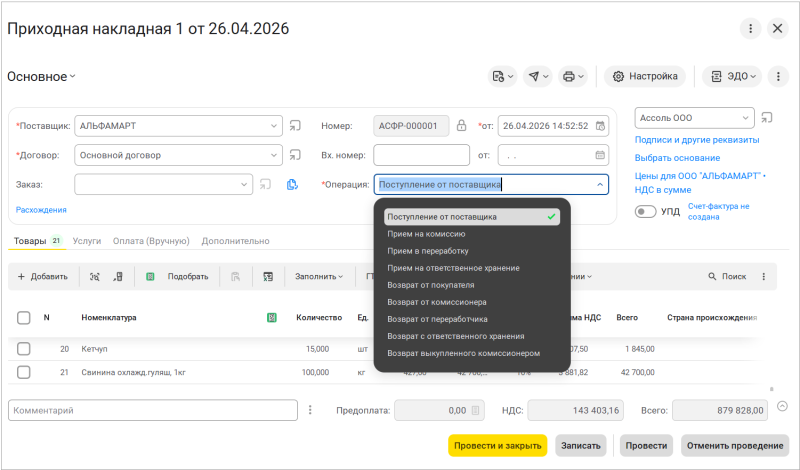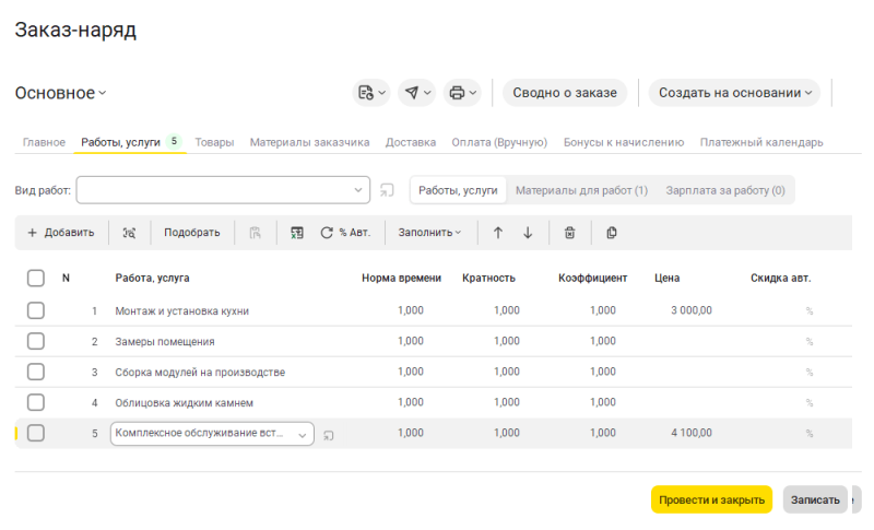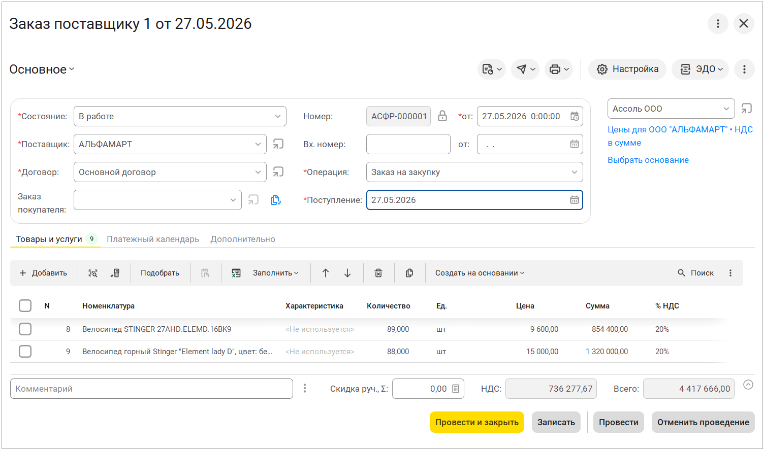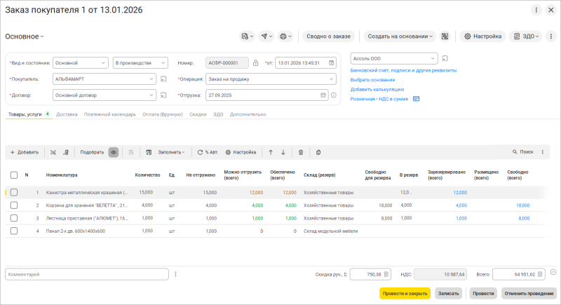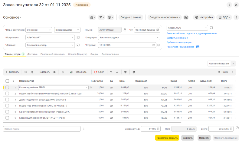 При создании документов есть возможность указывать процент или сумму скидки и наценки для каждого товара. Все скидки хранятся в справочнике «Виды скидок и наценок» и управляются в рабочем месте «Скидки и наценки».