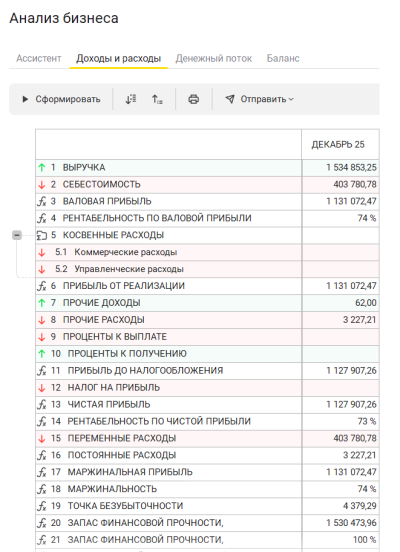 ✓ Оценивайте автоматические рассчитанные показатели прибыли, рентабельности, точки безубыточности, маржинальности.