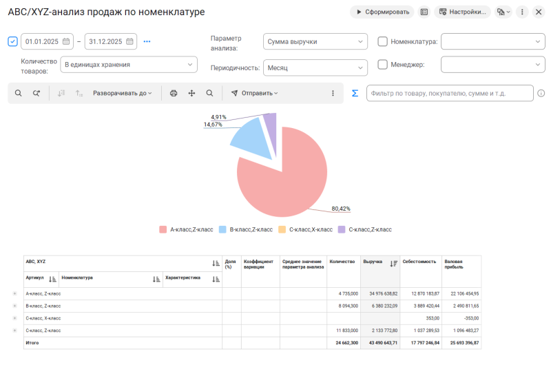 Руководителю бизнеса всегда доступна актуальная информация по продажам. Получаете готовый инструмент для управления продажами — ABC/XYZ-анализ продаж по товарам, клиентам и сотрудникам.