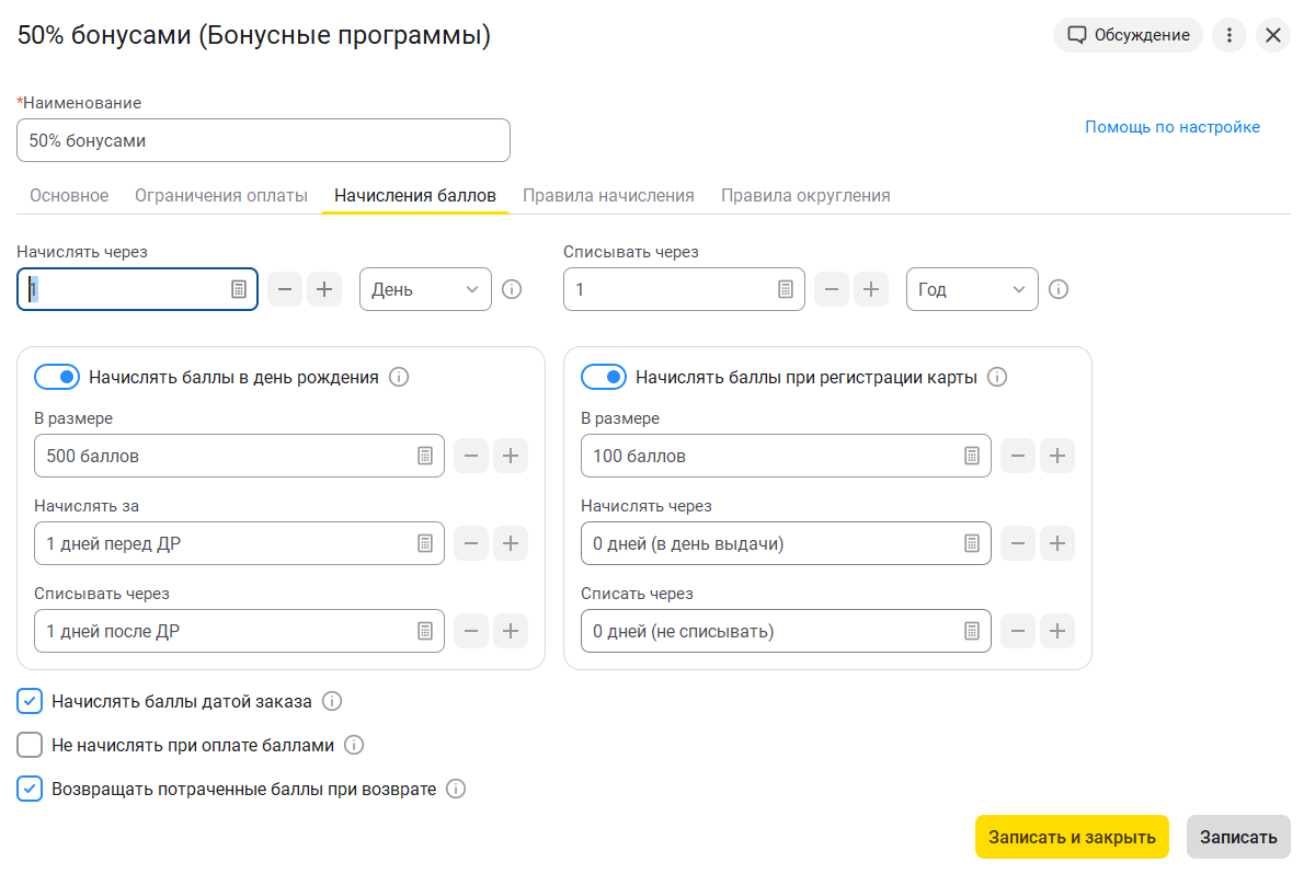 При создании бонусной программы можно уточнить процент оплаты для оплаты бонусами, а также порядок начисления и списания бонусных баллов. Действие правил начисления бонусов можно настроить отдельно для оптовой торговли, розницы или для конкретных складов, групп товаров, контрагентов