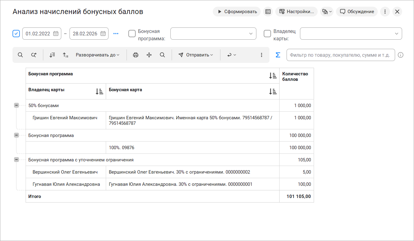 Бонусы начисляются клиенту при розничной продаже, если была предъявлена бонусная карта. Начисление бонусов происходит в момент пробития чека и фиксируется в чеке ККМ. Контролировать и анализировать результаты бонусных программ лояльности можно в отчетах «Анализ начисленных баллов» и «Остатки бонусных баллов».