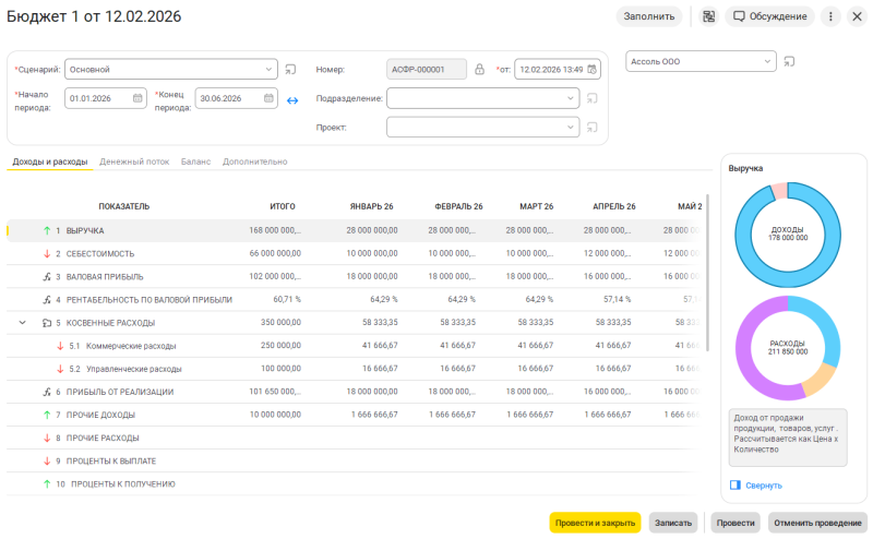Программа растет вместе с бизнесом и позволяет планировать свою деятельность: составлять бюджеты по нескольким сценариям на неделю, месяц, квартал, год.