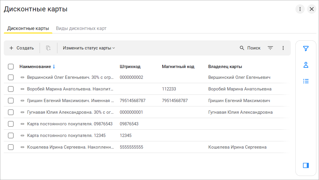 Дисконтные карты. В программе можно работать с дисконтными картами различных видов: штриховые и магнитные, обезличенные и именные. При создании дисконтной карты указываем наименование, величину скидки и пороги срабатывания. Например накопительная карта или карта постоянного покупателя. По каждой дисконтной карте можно вести дополнительную информацию и проанализировать продажи в отчете «Продажи по дисконтным картам».