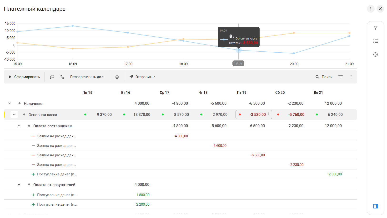 Управляйте онлайн будущими платежами непосредственно в Платежном календаре, перемещая поступления и выплаты по датам и между по кассам и расчетными счетами.