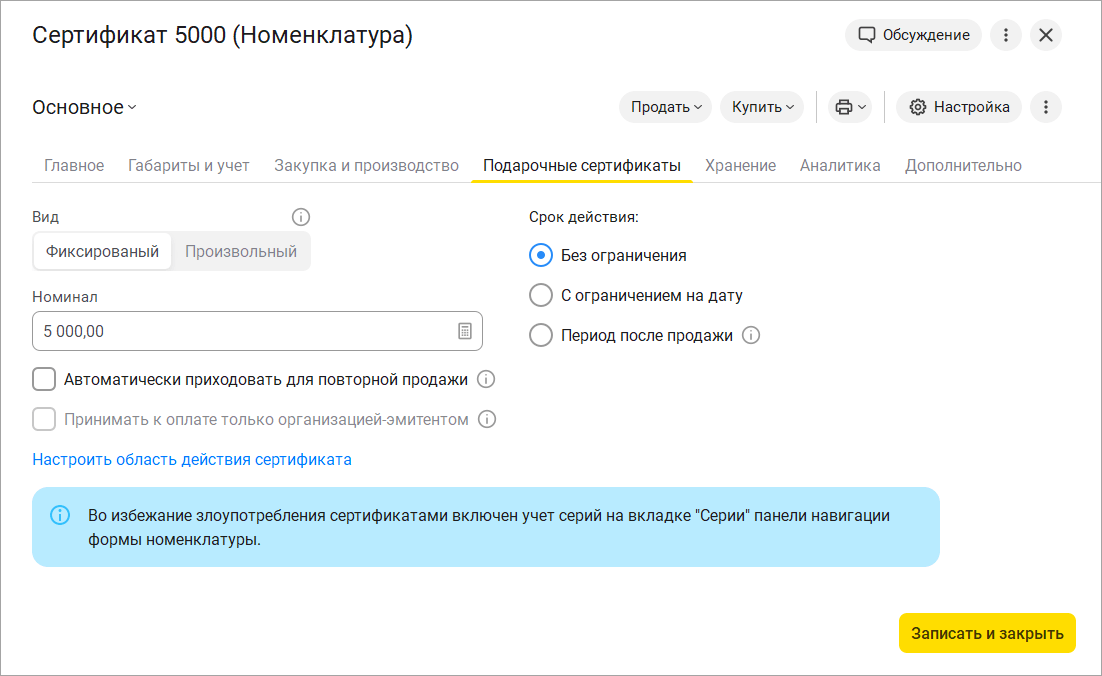 Подарочные сертификаты создаются как отдельный товар, указывается вид сертификата «Фиксированный» или «Произвольный», устанавливается срок действия сертификата. Можно настроить ограничения действия сертификата для товаров, категорий и ценовых групп.