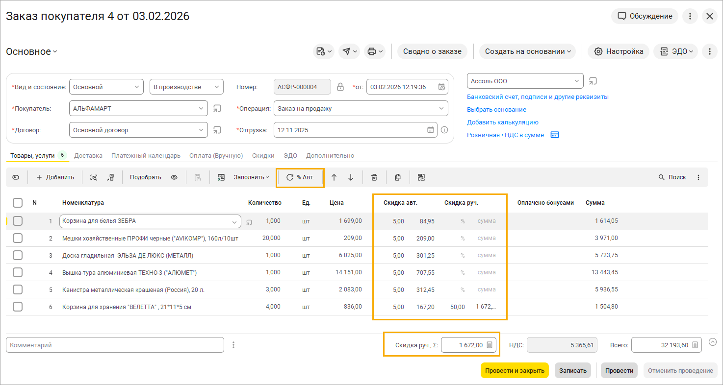 Автоматические скидки и наценки. Если есть правила формирования скидок, то их можно сразу создать в виде автоматических скидок. Скидки и наценки задаем в виде процента или суммы для каждого товара или всего документа.