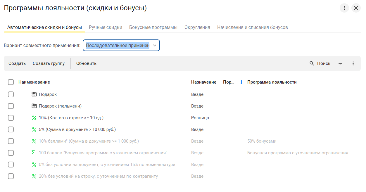Совместное применение скидок. В программе можно задать правила совместного использования скидок: сложение скидок, установление максимального или минимального значения скидки, использование в выбранном порядке или установить приоритеты для скидок.