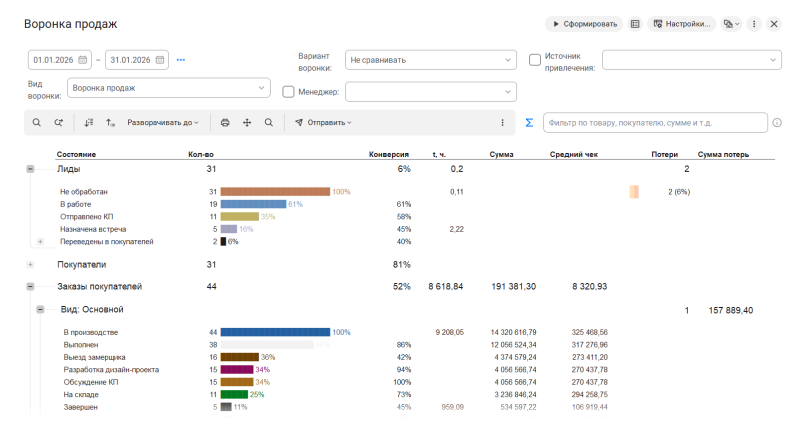 - вести клиента по воронке продаж с оценкой по источникам привлечения