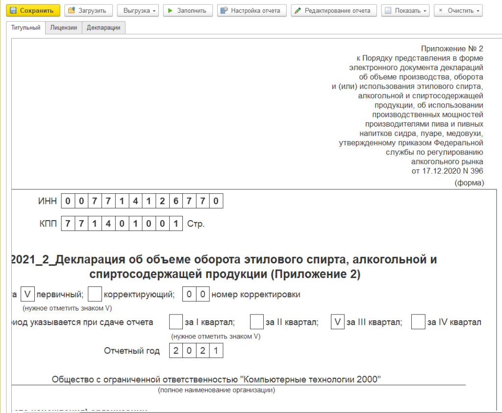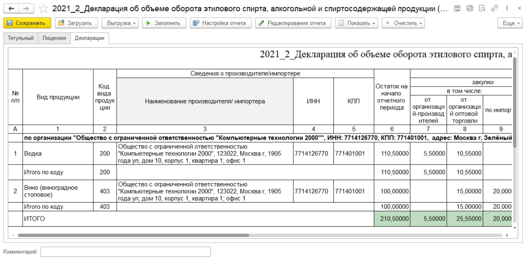 По декларированию оборотов алкогольной продукции в данную конфигурацию включены: Приложения с 1 по 8 — формирование данных производится в целом по организации, в Приложениях 2, 3, 4 — по всем оптовым складам, в Приложениях 7 и 8 — по розничным складам.