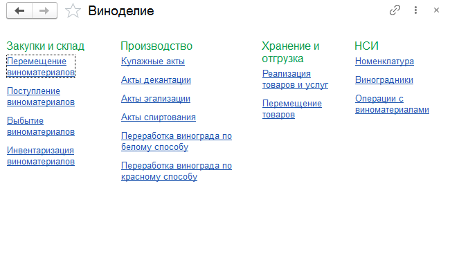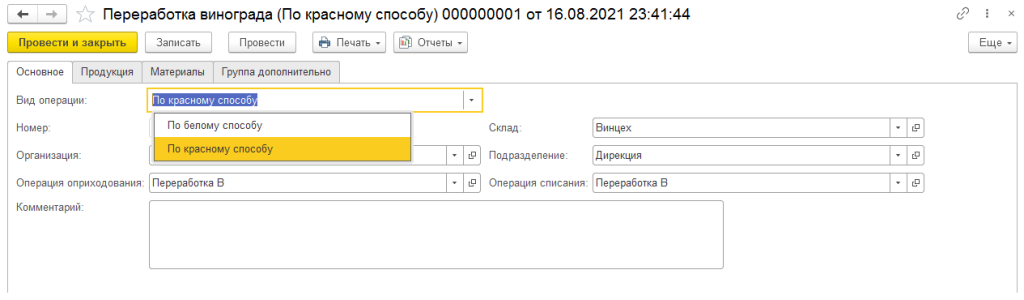 Для переработки винограда в системе предусмотрены документы переработки по «красному» и «белому» способам.
