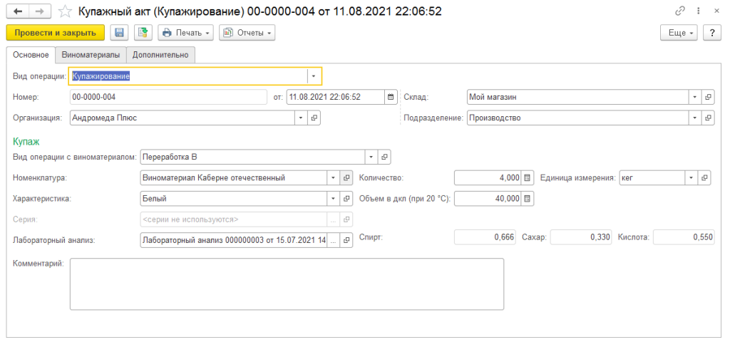 Купажирование – одна из ключевых операций технологического процесса. Для удобства, в систему добавлен отдельный документ «Купажный акт».