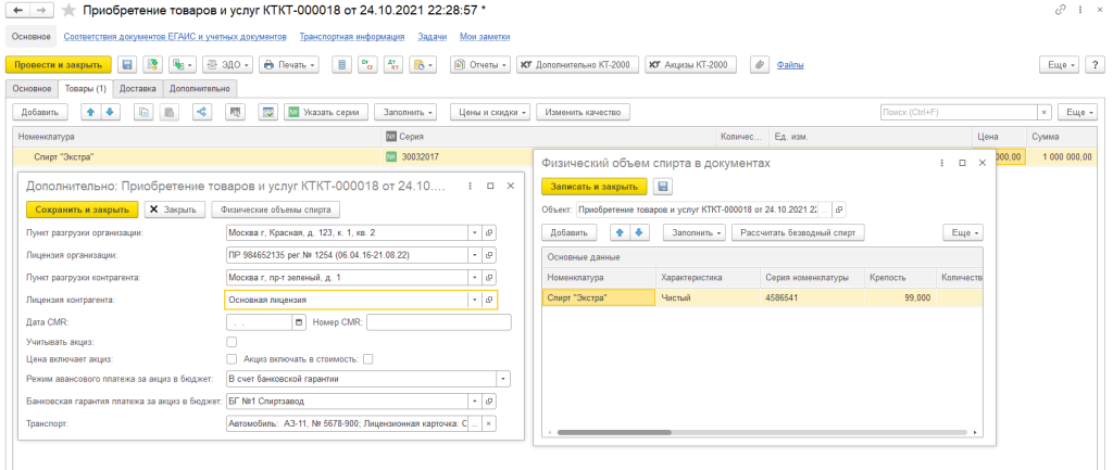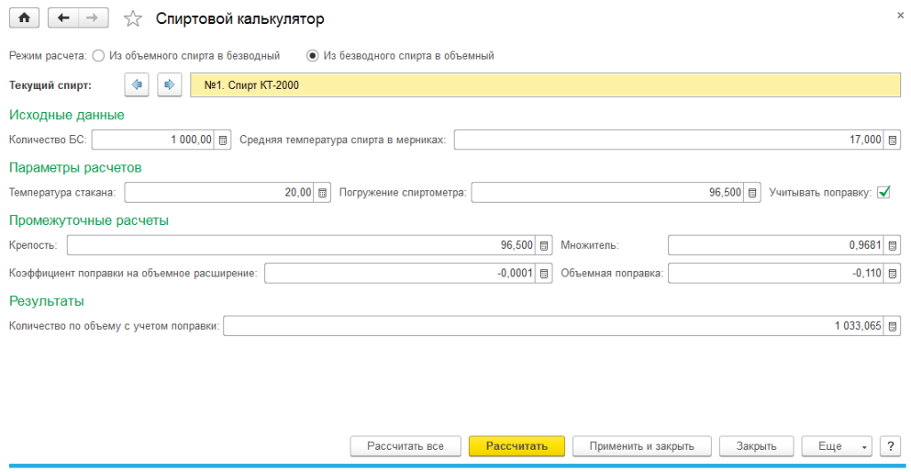 Для расчета спирта в учетных документах реализован «Спиртовой калькулятор».