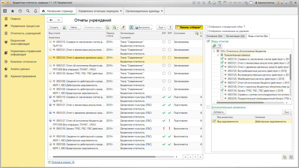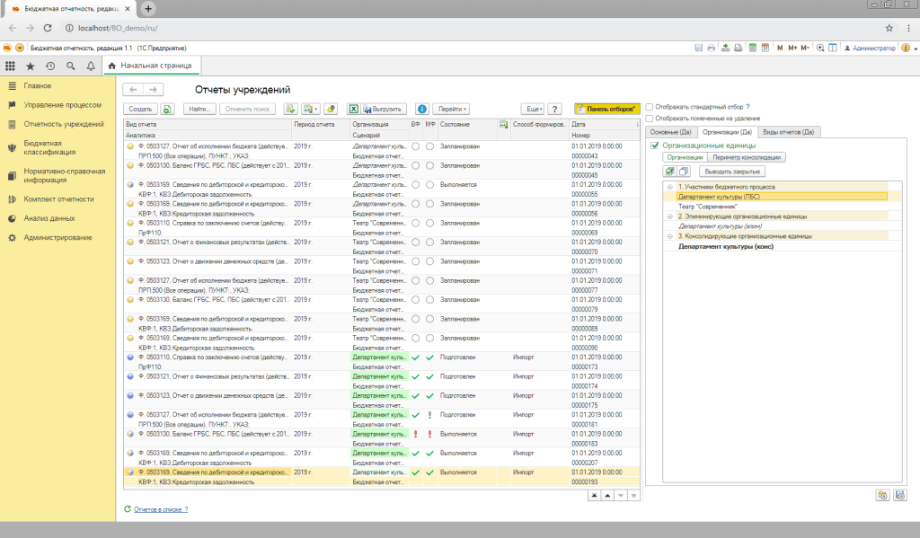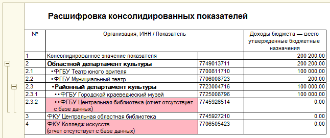 При расшифровке показателей консолидированного отчета учитывается иерархия организационной структуры, что позволяет наглядно контролировать корректность предоставления отчетов подведомственными учреждениями.