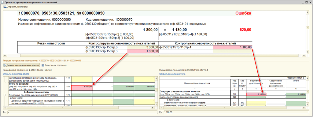 Протокол проверки предусматривает расшифровку до показателя отчетности с наглядным отображением сравниваемых показателей в экранной форме отчета.