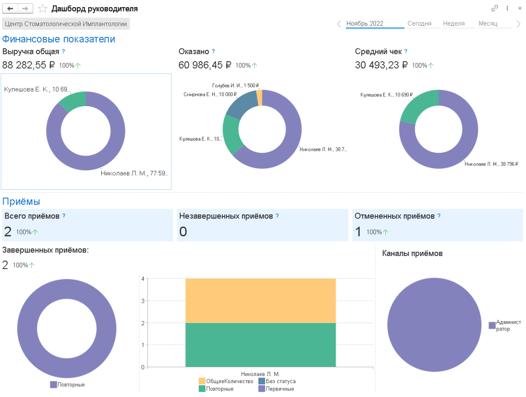 Детальная информация руководителю для оперативного управления клиникой – структура записей, выручка, сумма оказанных услуг, средний чек, статистика приёмов, загрузка врачей, стоимость часа работы врачей.
