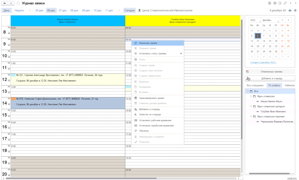 Журнал предварительной записи пациентов на обслуживание – удобный планировщик записей, статусы визитов клиентов, фильтры по мастерам. Каждая запись пациента находится под контролем, нет ошибок, перепланирования, видна недозагрузка персонала.