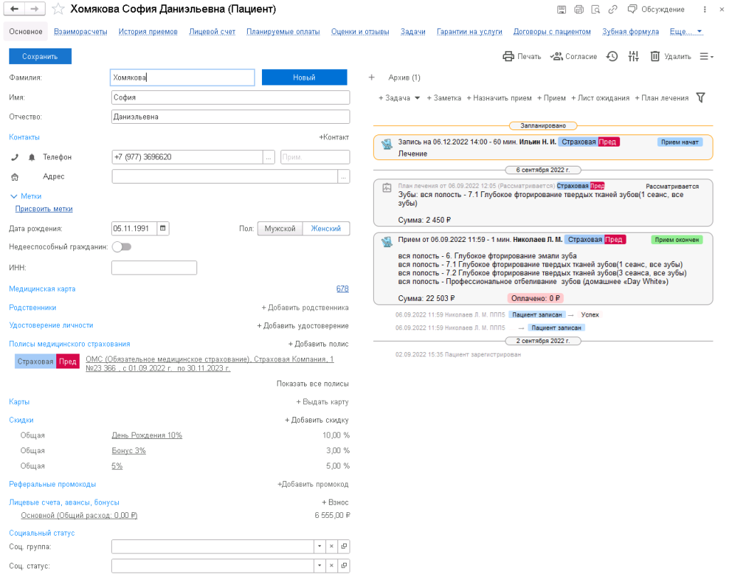 Ведение полной базы пациентов. Отражение в карточке пациента для администратора клиники полной информации о нем – статус пациента, медицинская карта, социальный статус, медицинские показатели, контактная информация, теги, удостоверения личности, родственники, договора, взаиморасчеты и многое другое.