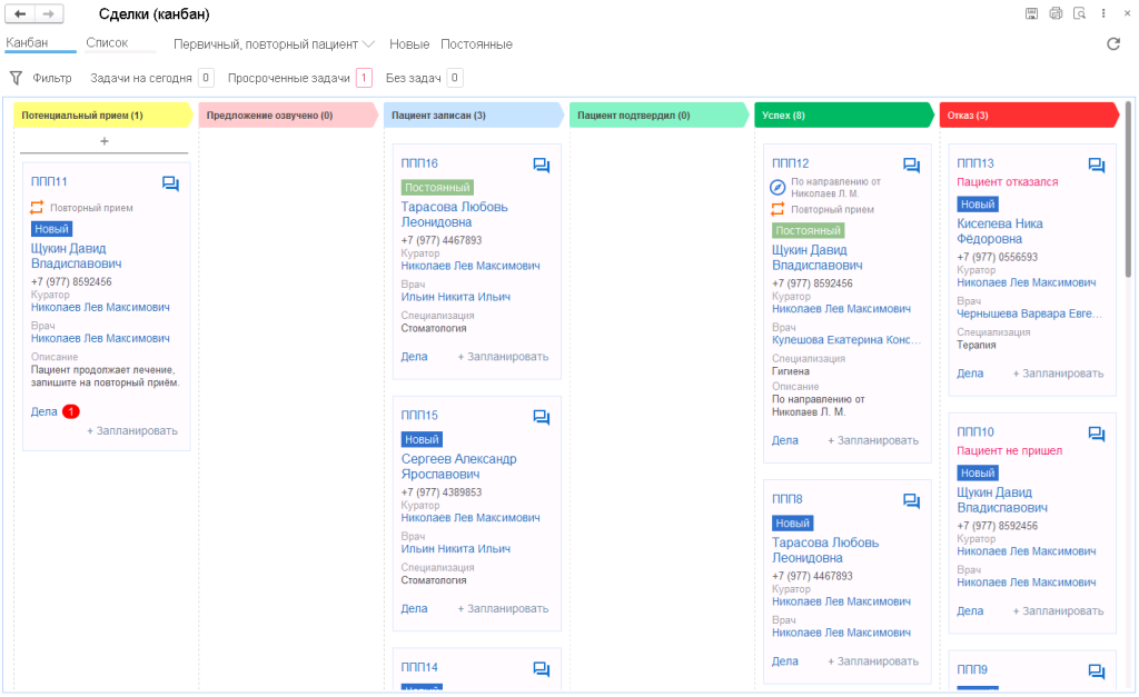 Полный контроль сделок по первичным и повторным пациентам. Возможность настройки собственных сделок с указанием этапов. Автоматическое движение пациента по этапам сделки.