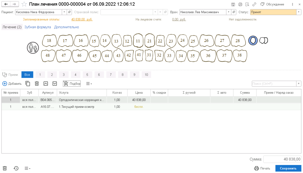 Решение позволяет вести учет планов лечения пациентов, когда для осуществления лечения пациенту необходимо осуществить несколько визитов клинику. Программа позволяет планировать прохождение плана лечения, а также контролировать его оплату и оказание запланированных услуг.