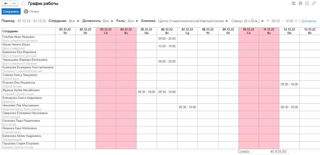 Решение обеспечивает планирование графика работы сотрудников и учет фактически отработанного времени работы персонала, формируются отчеты по персоналу (возвратность клиентов, взаиморасчеты с персоналом, расшифровка начислений и удержаний и другие отчеты).
