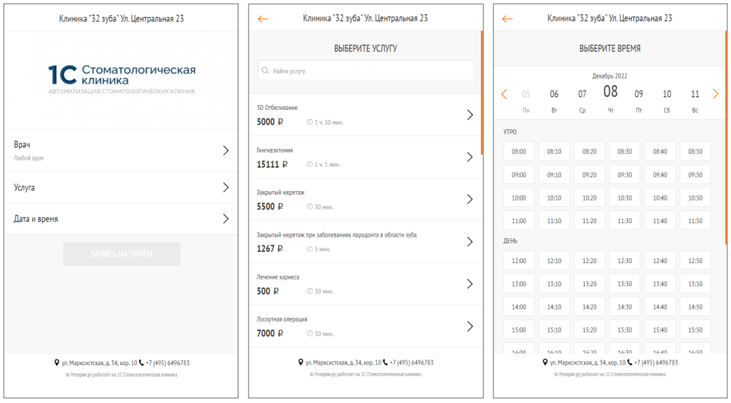 Интеграция решения с сервисом онлайн-записи «Резервируй» позволяет подключать виджеты онлайн-записи на услуги через сайт клиники или социальные сети.