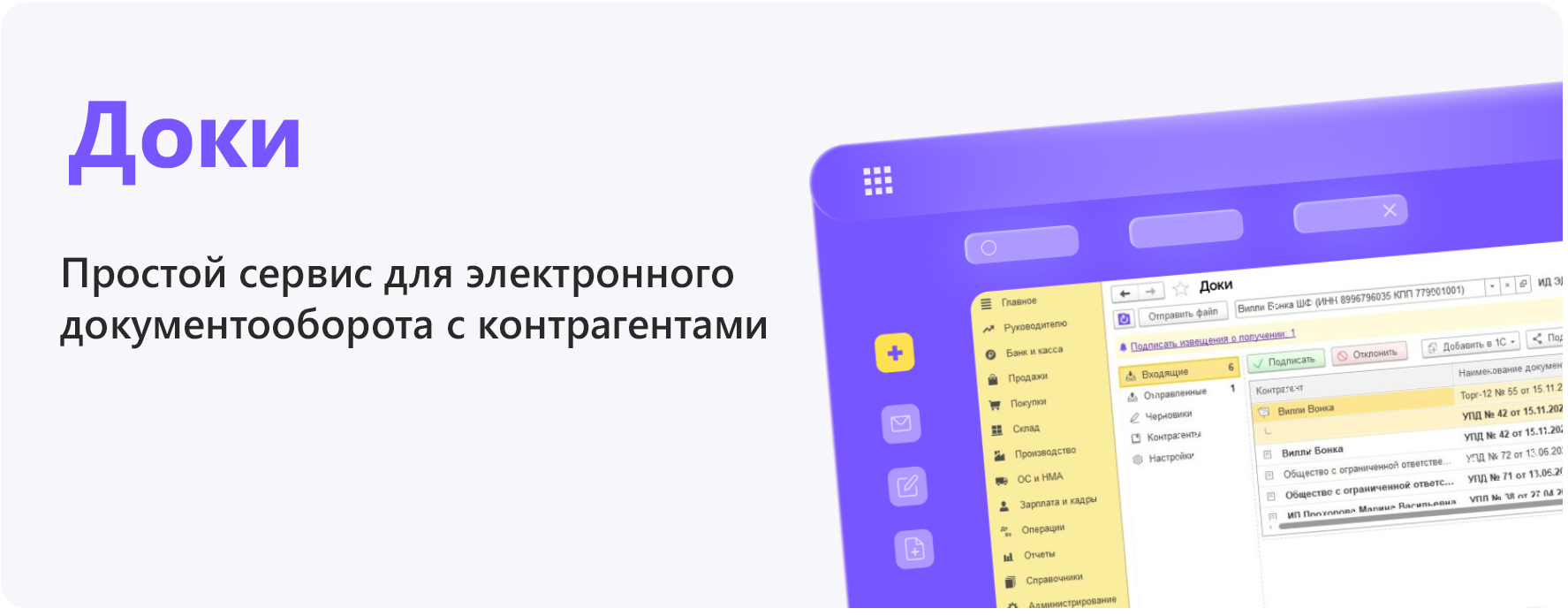 Система «ДОКИ» — совместная разработка Фирмы 1С и компании «Астрал», которая позволяет удобно и быстро работать с электронными документами как в программе 1С, так и через браузер в веб-версии. Сервис открывает перед пользователями новые возможности ЭДО: отправлять и получать документы в программах платформы 1С:Предприятие 8, а также подписывать документы онлайн с любого устройства.