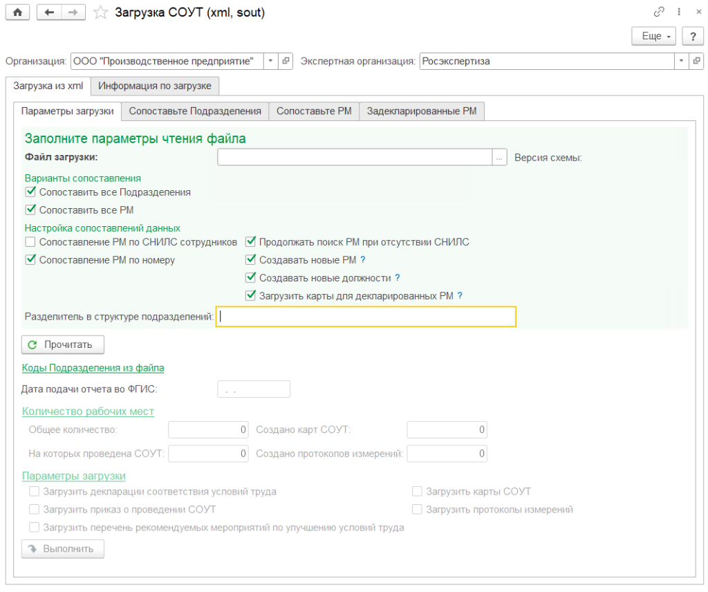 Организация, проводящая специальную оценку условий труда, по результатам своей работы предоставляет файл в формате *.xml или *.sout, который возможно загрузить в систему. При загрузке файла в формате система сравнивает информацию об организации из загружаемого файла с информацией об организации в системе. Если сопоставление найдено, то становится доступной возможность загрузки. При чтении файла, в системе отображается информация об общем количестве рабочих мест и количестве рабочих мест, на которых была проведена специальная оценка условий труда.
