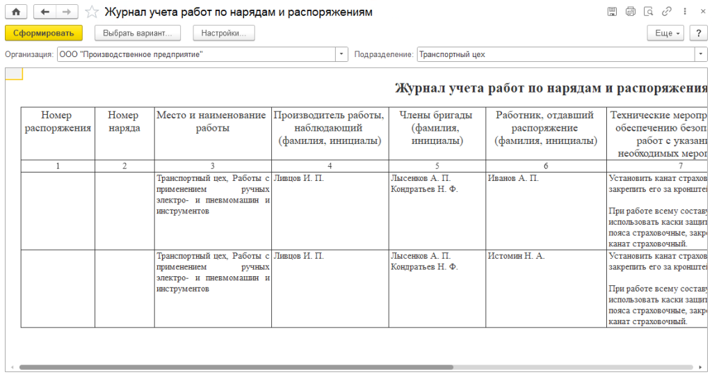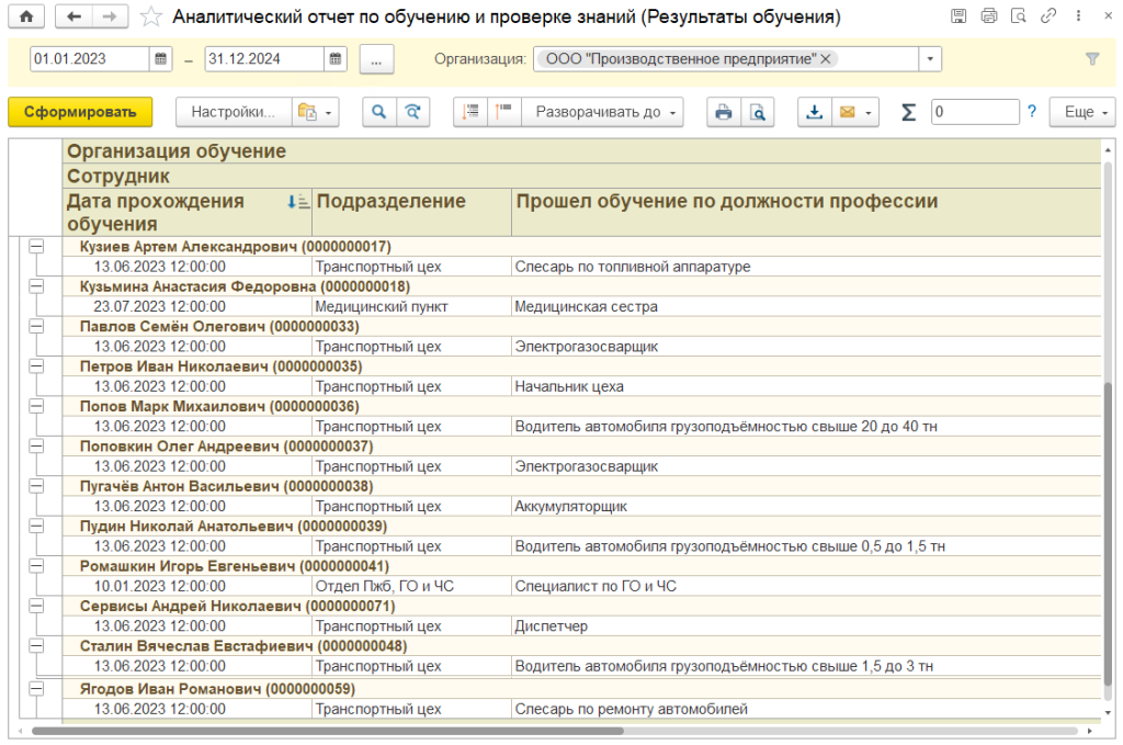 Система позволяет осуществлять планирование и фиксацию результатов проведения стажировок, инструктажей, обучения и проверок знаний сотрудников в области охрана труда, окружающей среды промышленной и пожарной безопасности. Реализовано формирование следующих документов: