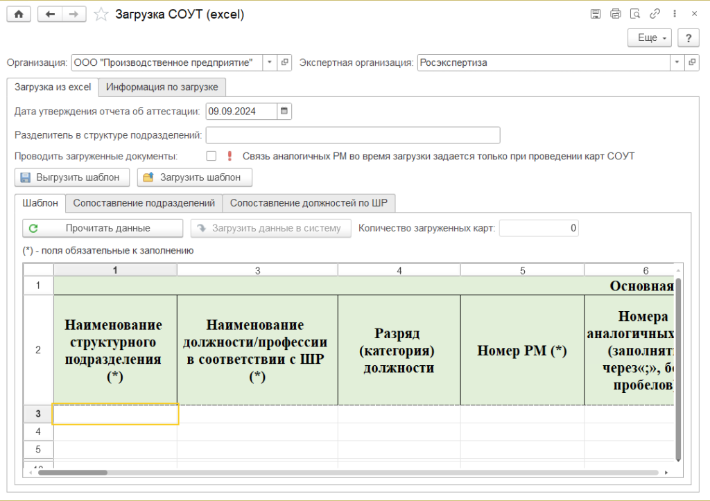 Система позволяет загружать сведения о результатах специальной оценки условий труда также из табличного документа. Если в документе будут найдены подразделения, которые не удалось автоматически сопоставить с подразделениями в системе, то на вкладке «Сопоставьте подразделения» есть возможность выполнить сопоставление вручную.
