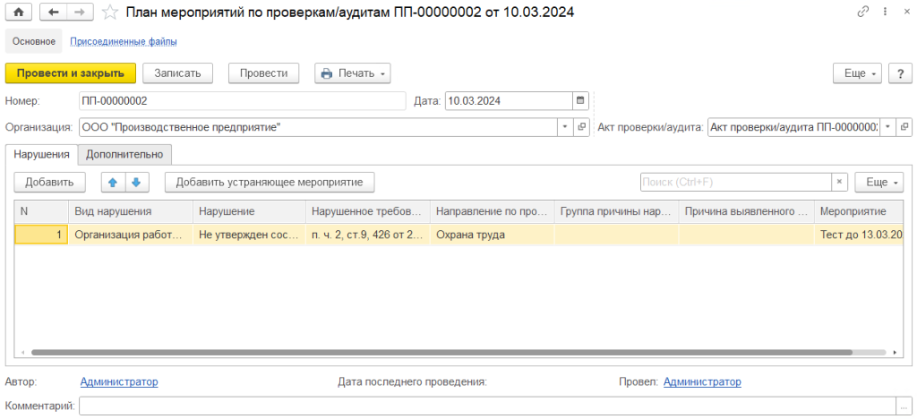 Проведение внутренних проверок на предприятии позволяет получить объективную информацию о выполнении установленных требований. В системе реализована возможность формирования планов проверок, учета их результатов, а также планирования мероприятий для устранения выявленных нарушений.