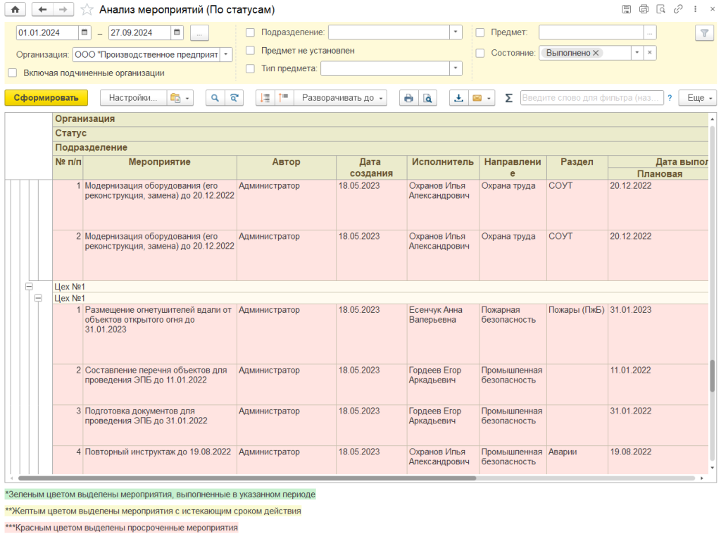 При планировании мероприятия учитываются дата выполнения, ответственные за выполнение, источники финансирования и стоимость. Система автоматически напоминает о сроках проведения мероприятий и уведомляет участников процессов о ходе выполнения мероприятий.