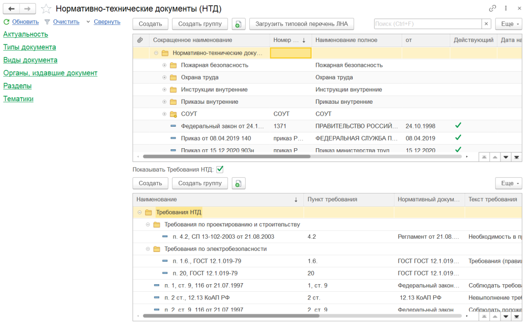 В системе ведется учет сведений о нормативно-технической документации, а также ее требований. Документация может быть как внутренней (внутренние положения предприятия), так и федеральные законы, постановления и т.п. При формировании перечня нарушений в системе, предоставляется возможность указания пункта нарушенного требования.