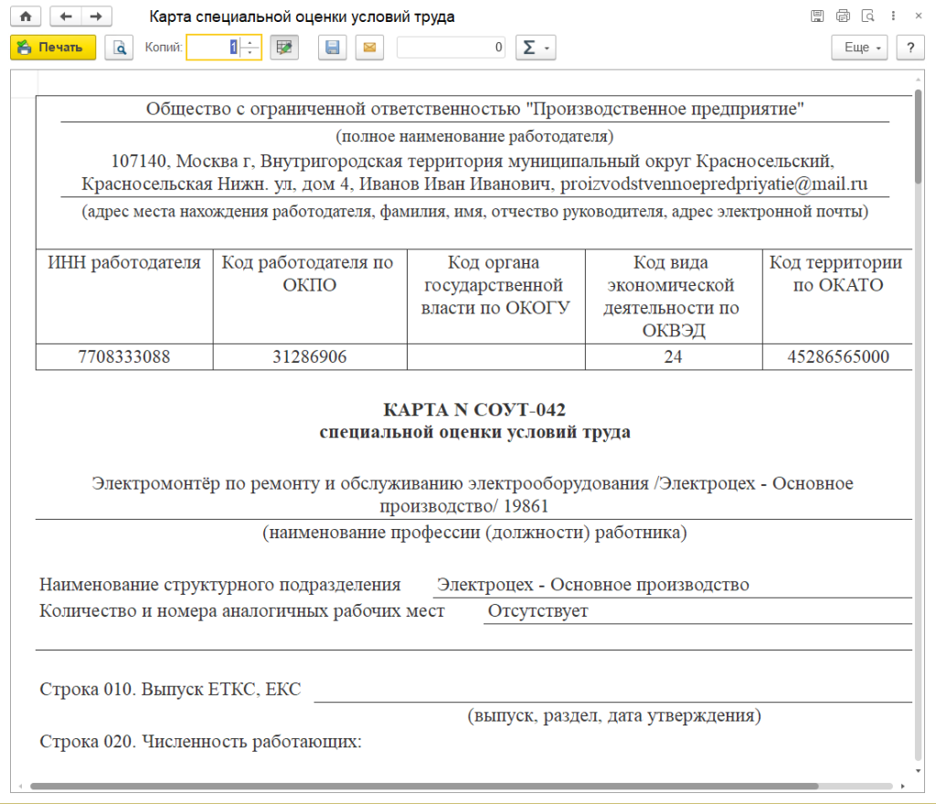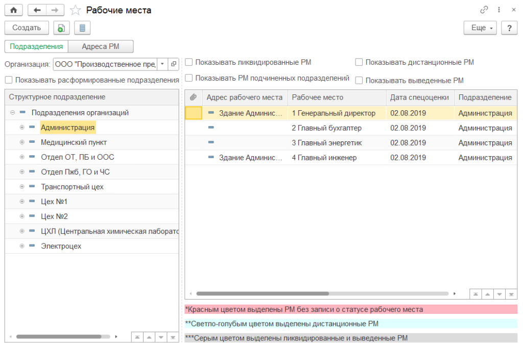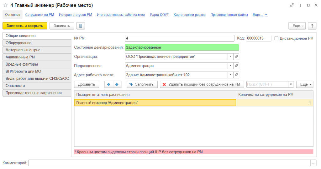 С полной информацией о состоянии условий труда на конкретном рабочем месте, можно ознакомится в одном окне программы: