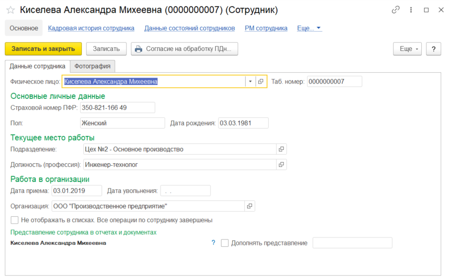 В системе ведется учет сведений об организационной структуре предприятия, а также сведений о сотрудниках: